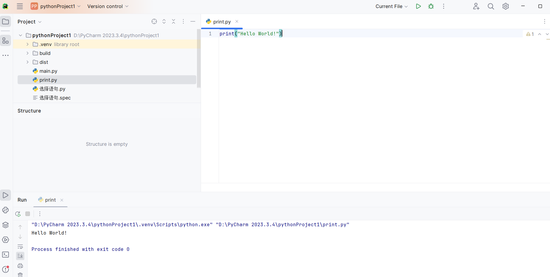 2)进入PyCharm,点击创建New-Python File,设置好存储路径(我将存储路径设置为了D/PyCharm 2023.3.4),进入Python开发界面。跟随老师课堂指引和学习通视频资料演示熟悉Python开发环境。如, PyCharm 的主要界面和布局,常用的快捷键等,了解 PyCharm 提供的丰富功能。