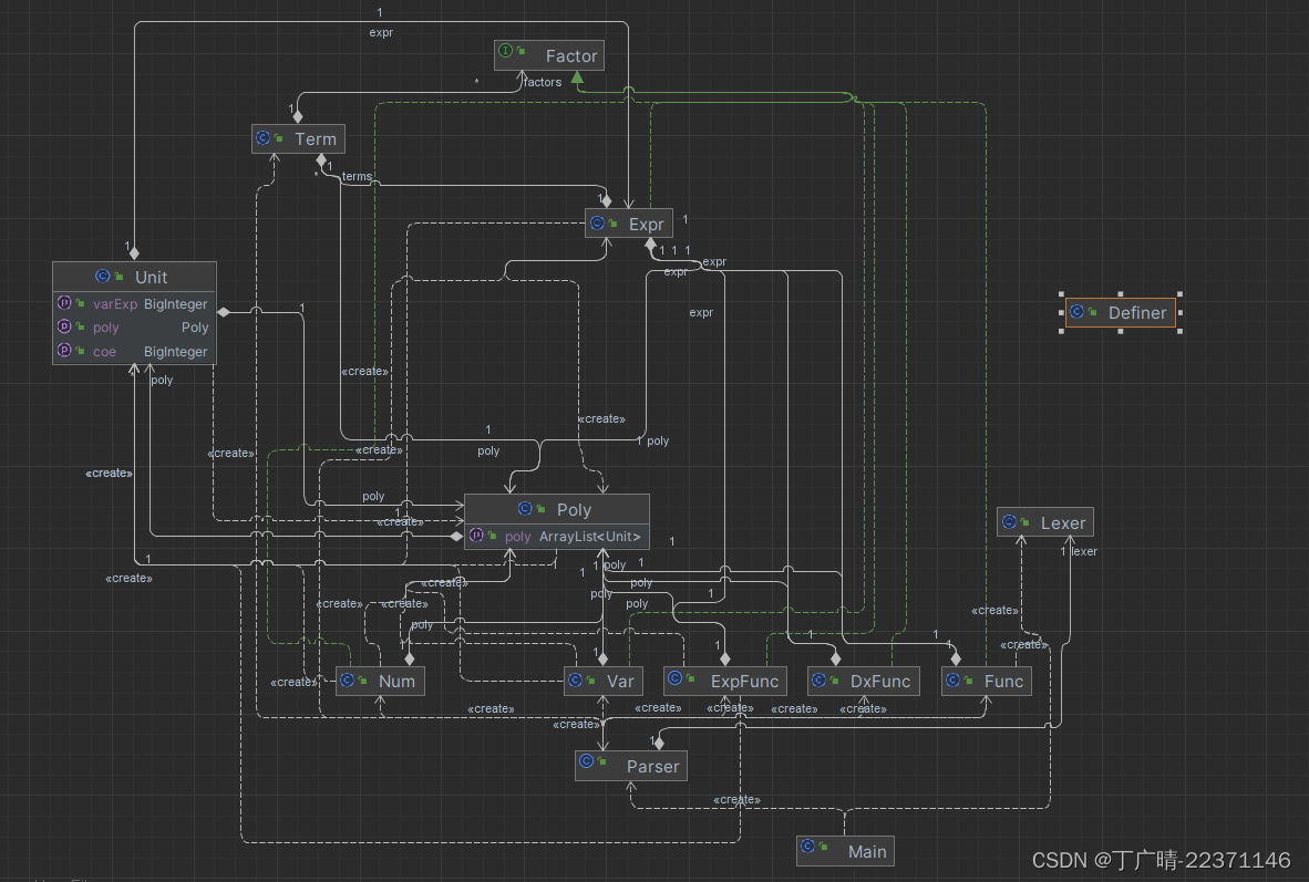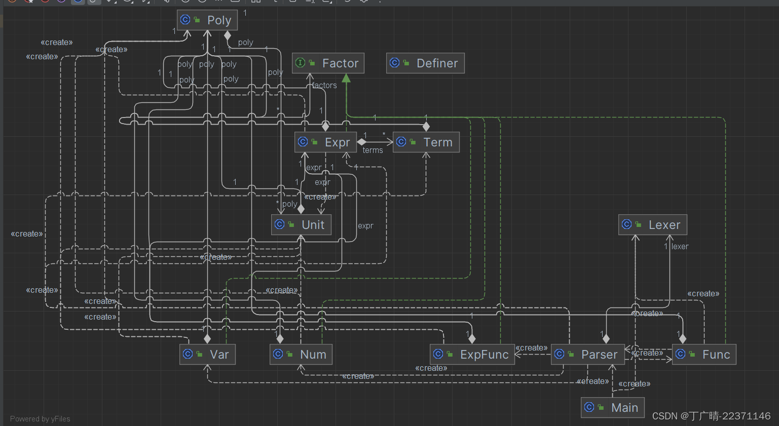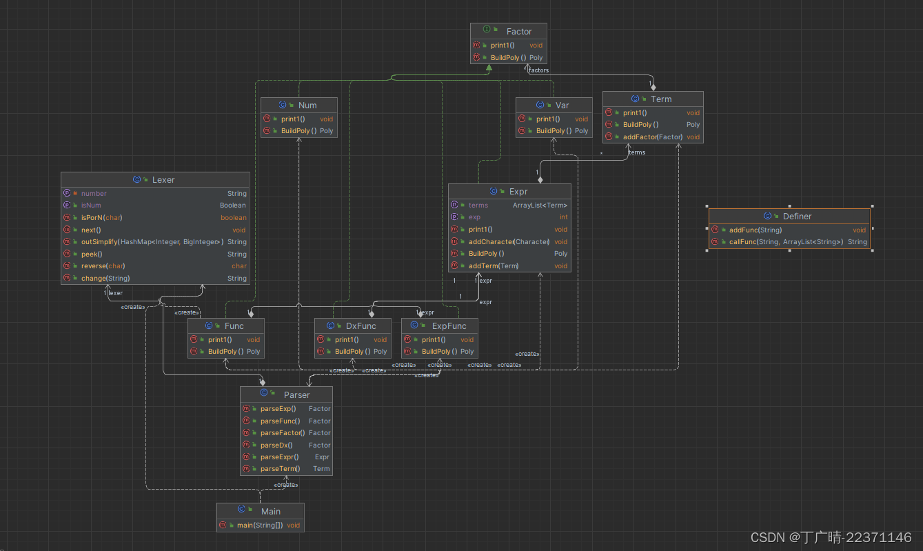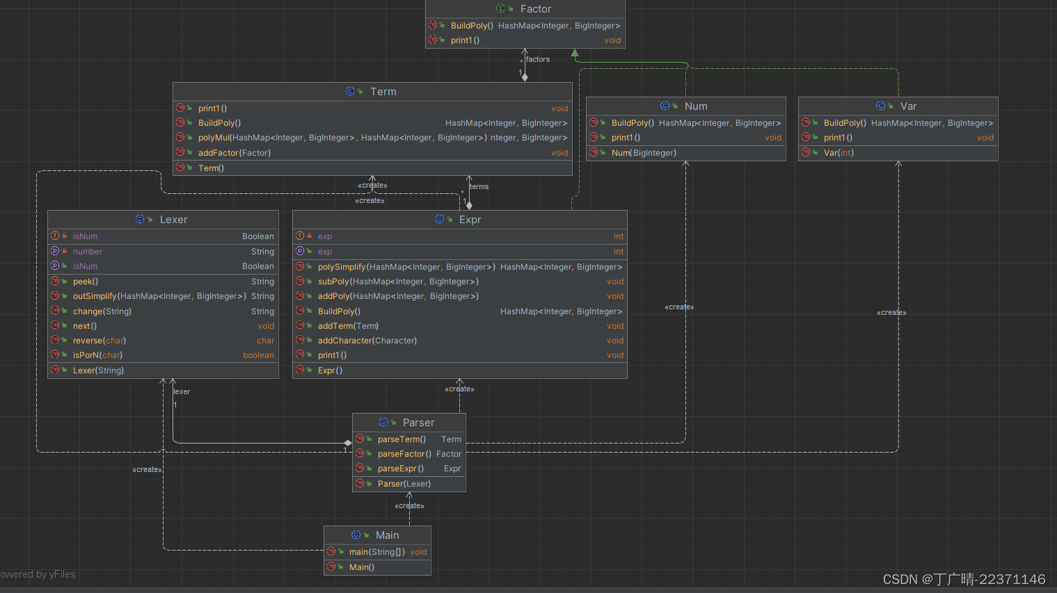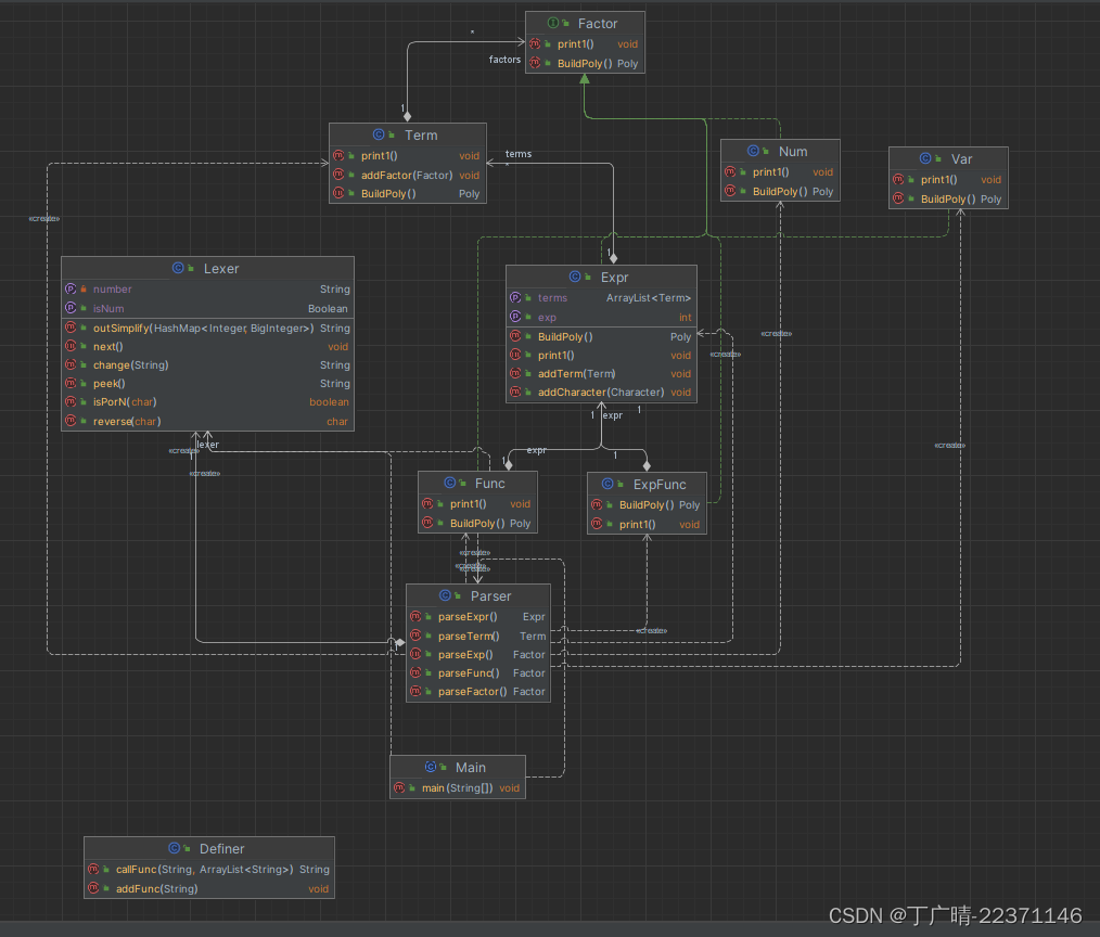 表达式,项,因子都建造BuildPoly方法,假设组成表达式的各个项的poly都已知,构建表达式的poly,这样同理往下写,直接调用一个顶层表达式的BulidPoly,就会自动递归建造所需表达式,然后进行表达式输出与化解即可。(化简等部分由于三次作业逐次增加,在下面统一说)