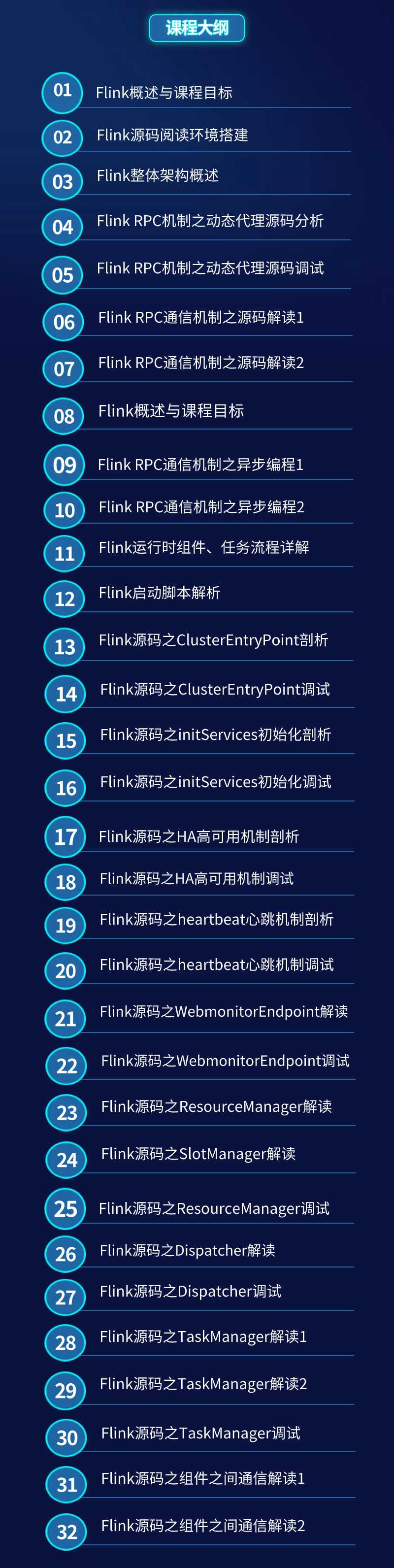 本课程将直接从FLink的源码入手,通过详细解读和分析,让您深入了解FLink的工作原理、架构设计以及性能优化等方面的知识。帮助您将理论知识与实际应用相结合,更好地掌握核心技术。