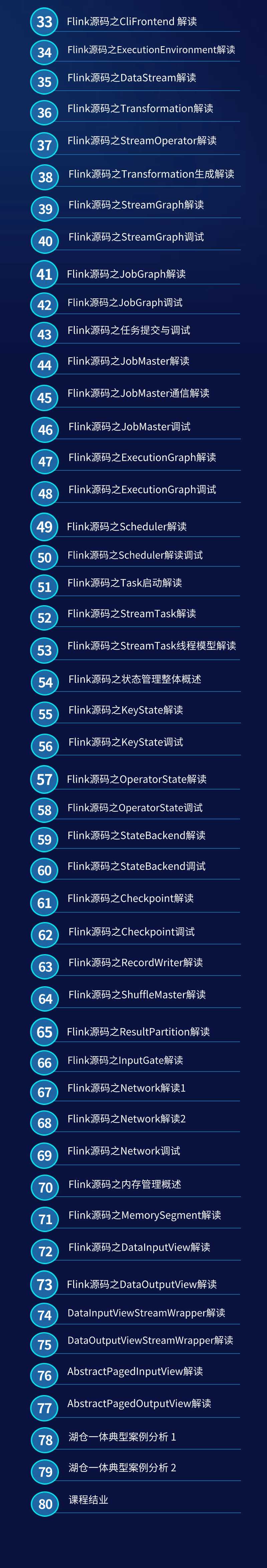 | 揭秘Flink 1.19源码深度剖析 | 1.想深入了解Flink底层的学员 2.有Flink基础想快速精通Flink底层原理设计的学员 3.有大数据基础想快速积累Flink经验的学员 4.期望向apache 贡献代码的学员 |