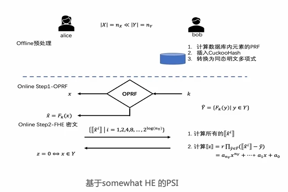 - Alice和Bob通过执行PSI协议,得到交集结果XnY