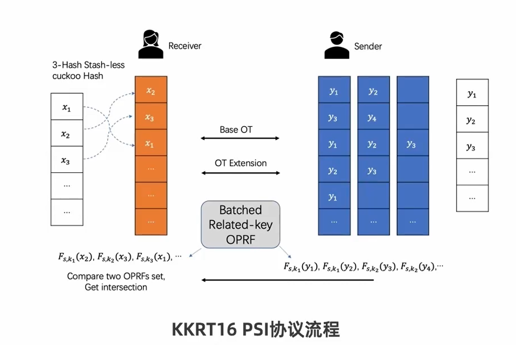 [KKRT16] 是半诚实 OT-based PSI协议,基于 OT Extension, BaRK-OPRF 和 CuckooHash。 [KKRT16] 是第一个在千万( 224224)规模,长度(128 bits)数据集上,求交时间在1分钟之内的PSI协议.