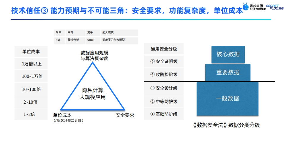 在技术信任中的能力预期与不可能三角:安全要求,功能复杂度,单位成本,这三个是不可能全部取优的,在以后通过技术突破,隐私计算成本从万倍以上 降至百倍、十倍甚至两倍以内。