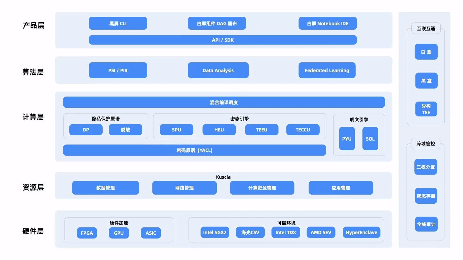 定位:支持多种可信执行环境的,具备数据使用跨域管控能力的密态计算枢纽,可执行数据分析、机器学习、MPC / FL加速等功能。