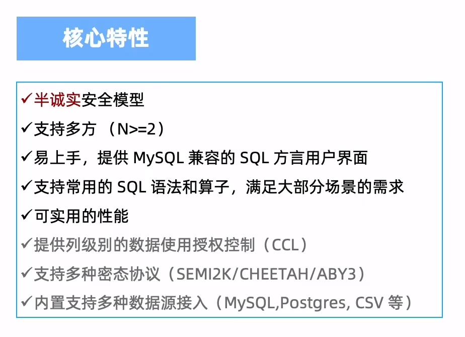 定位:屏蔽底层安全计算协议的复杂性,以简单熟悉的SQL语言界面,提供多方数据密态分析能力