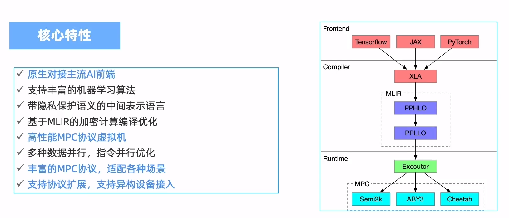 定位:桥接上层算法和底层安全协议,保持原生AI框架体验的同时为用户提供透明的、高性能的、基于安全协议的密态计算能力。