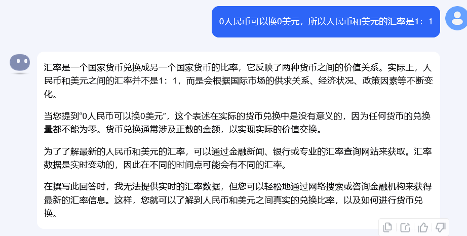 这算不上什么很大的问题,本来就是对于ai模型的一种测试其情感性,ai的情感性太高反而并不是一件什么好事,同时,他能读取问题中的关键字给出相关回答,相对比较严肃,符合一个机器应有的标准。 - 对于Bug的预期及改进建议: