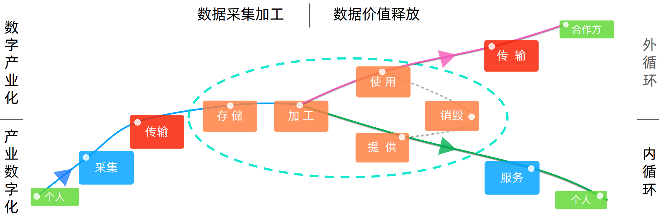 数据流转链路主要包括:采集、存储、加工、使用、提供、传输