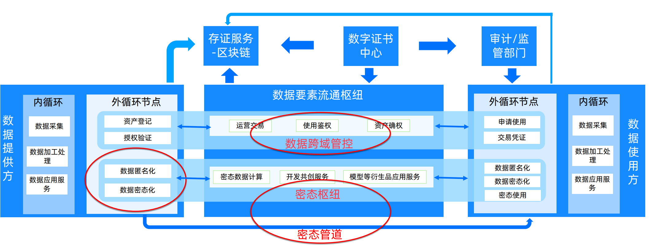 • 数据面:以 隐私计算 为核心支撑技术构建 密态数联网,包括 密态枢纽 与 密态管道