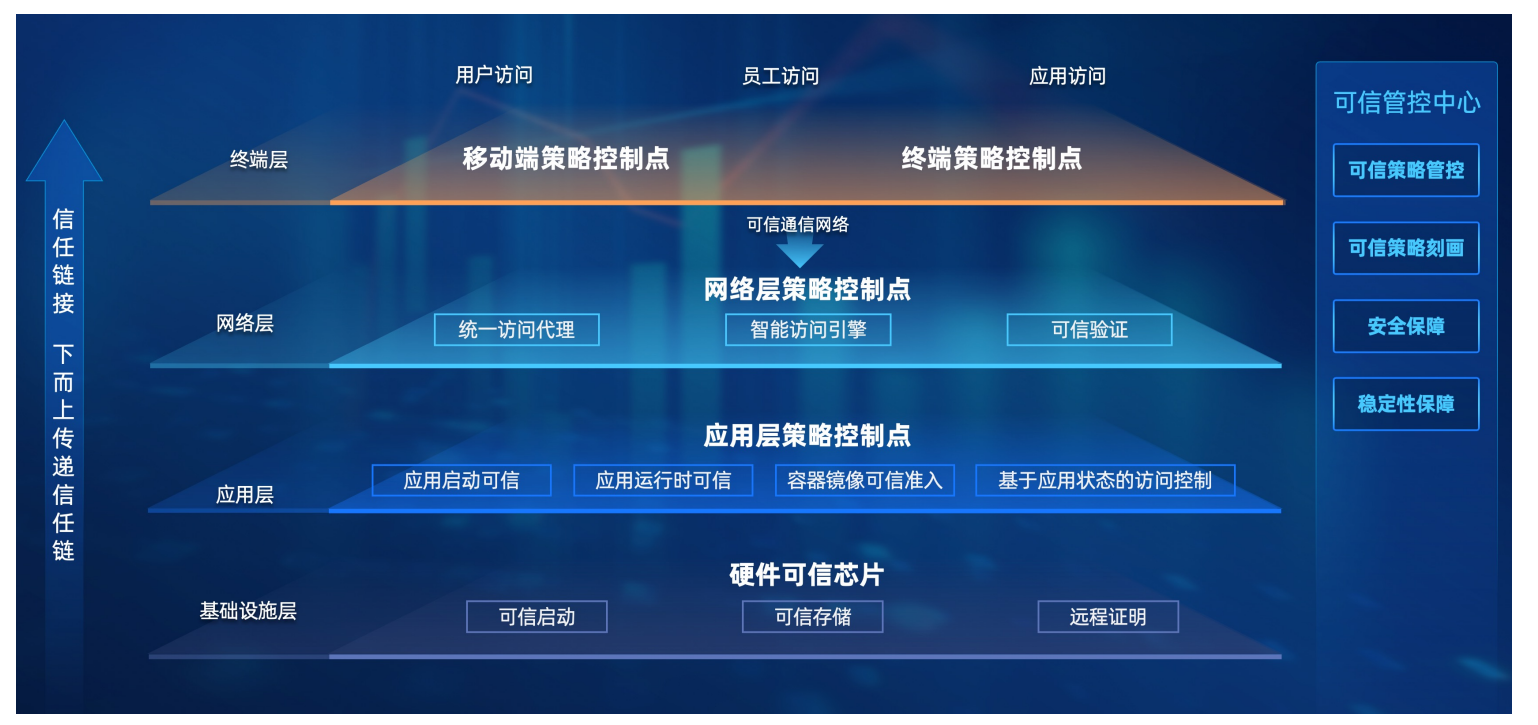 • 完备的信任链:从信任根、硬件平台、操作系统到应用系统整个链路的可信认证