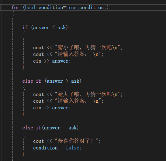 for (bool condition=true;condition=true;)——for循环语句的循环条件改成condition的话,只要答对就会无限循环。直接写condition不是等同与condition=true吗?