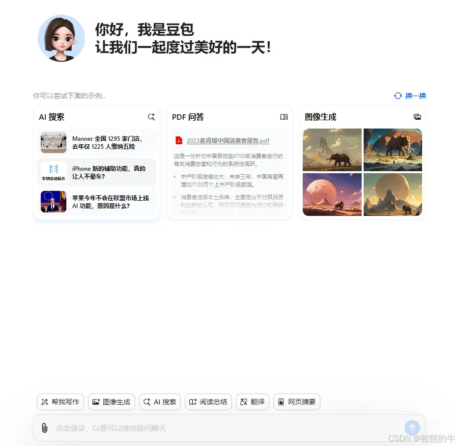 豆包是由字节跳动公司推出的一款多功能人工智能工具和免费AI聊天机器人,具备文案创作、PDF问答、长文本分析、学习辅助、图像生成、信息搜索与整合等能力。