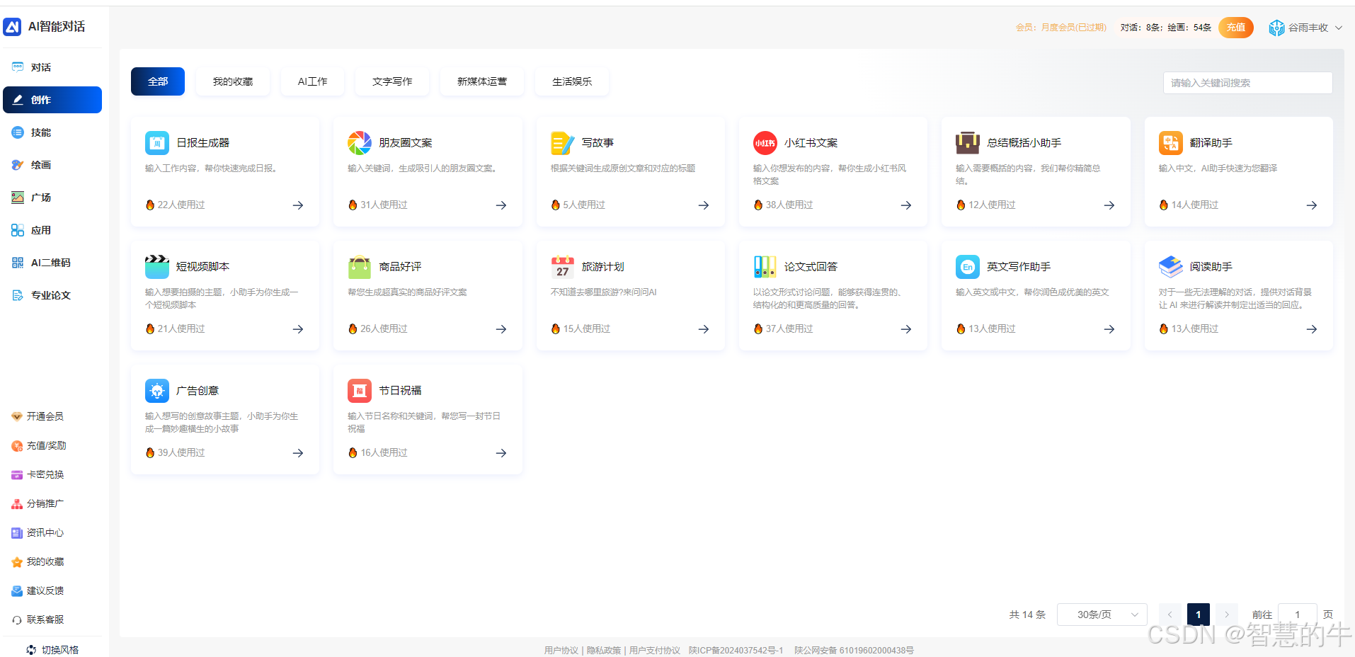 AI一会儿是陕西艾一会儿有限公司开发的智能对话系统,能够与用户进行智能对话,并针对AI工作、文字写作、新媒体运营和生活娱乐提供了多种不同内容和格式的内容创作功能。