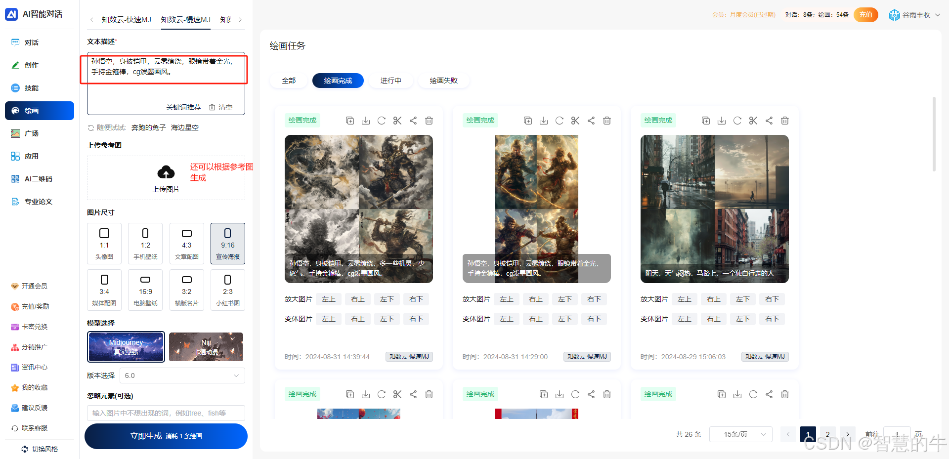 AI绘画接入了Midjourney和SD意间绘画,通过简单的语言描述和参数选择就能生成出质量好、创造性强的作品,用于图标设计、绘画制作或者个人欣赏,如文章中出现的"悟空"图片。