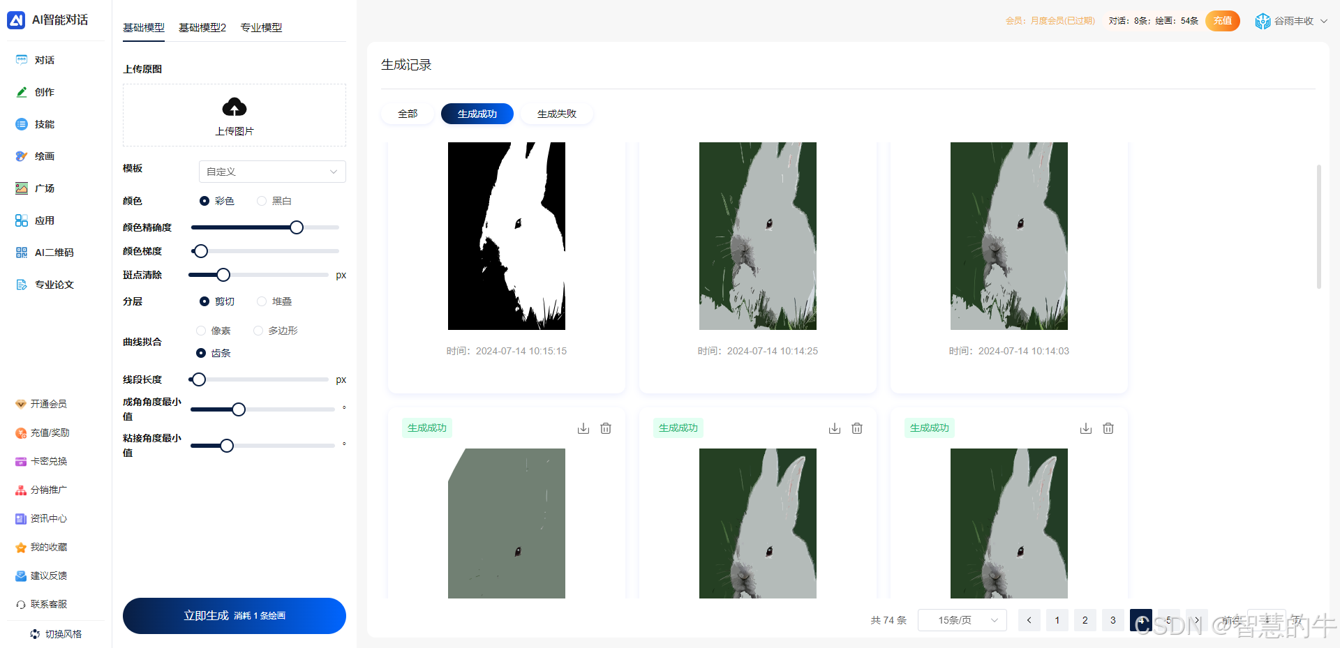 还提供了AI矢量图功能,这个功能能够将普通图片矢量化,导出svg等格式,图片缩放不失真,通过不同的参数组合能够对图片的颜色、边缘角度进行设置。