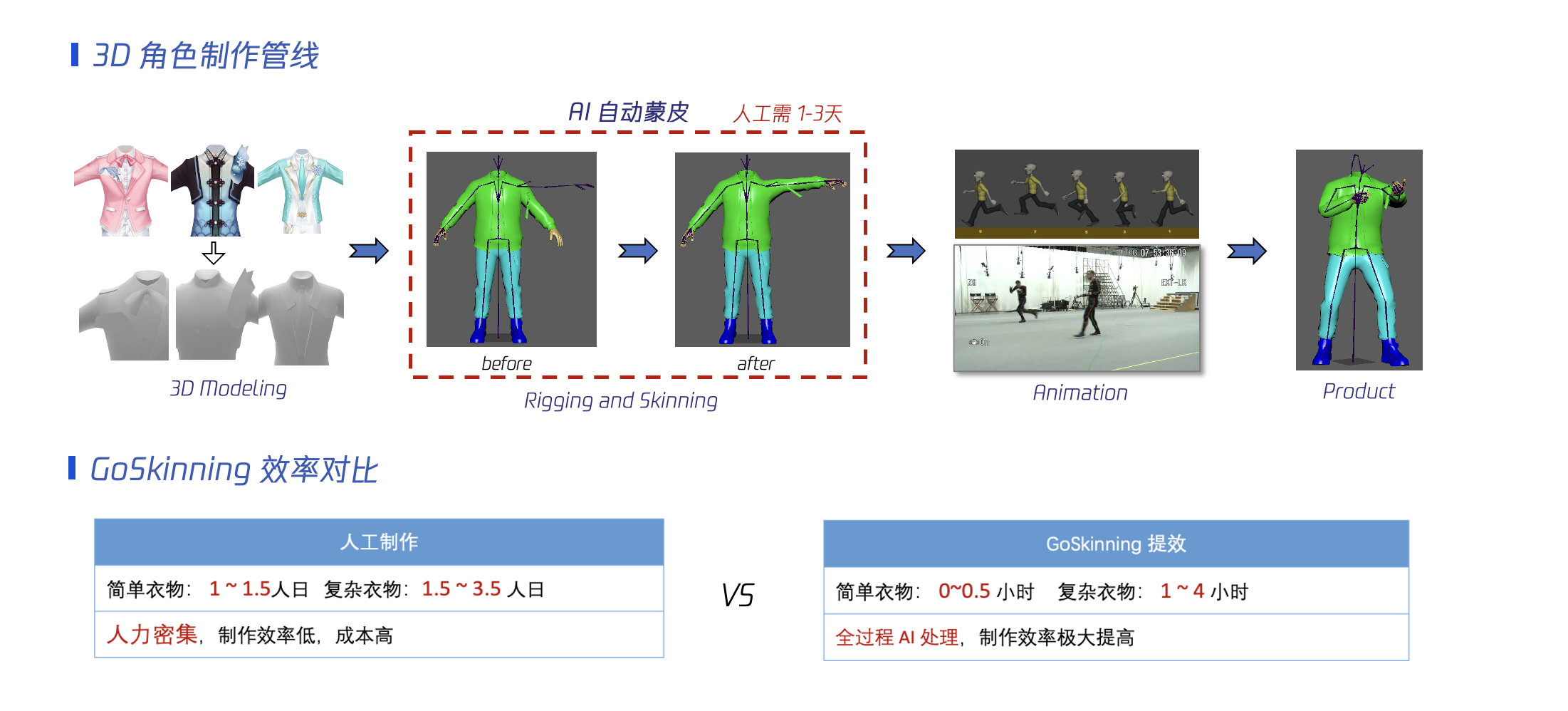 AI自动蒙皮技术通过预测权重矩阵,实现了一键自动蒙皮的效果。对于简单衣物,制作时间可缩短至0至0.5小时,复杂衣物也仅需1至4小时,极大提升了制作效率。
