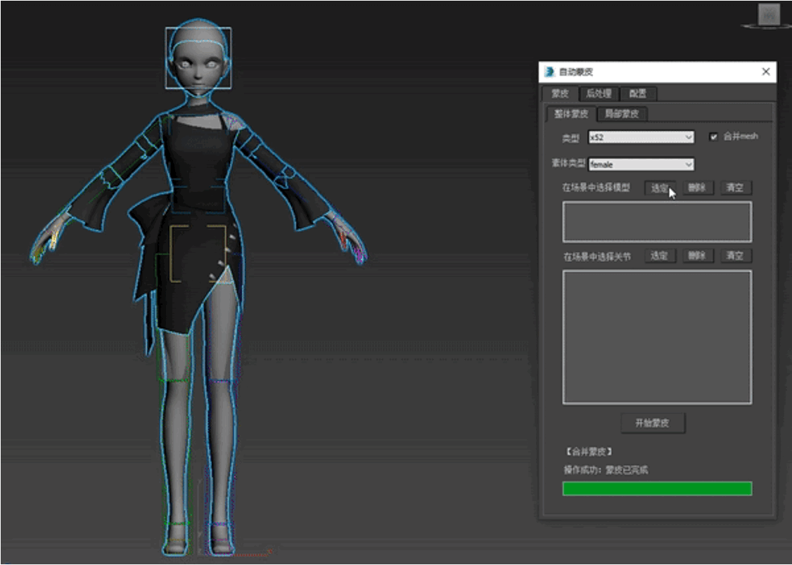 整体蒙皮,顾名思义就是对整个角色模型进行绑定蒙皮,用户输入整个角色模型及其骨骼,整体蒙皮 AI 自动预测出所有顶点的权重绑定结果。