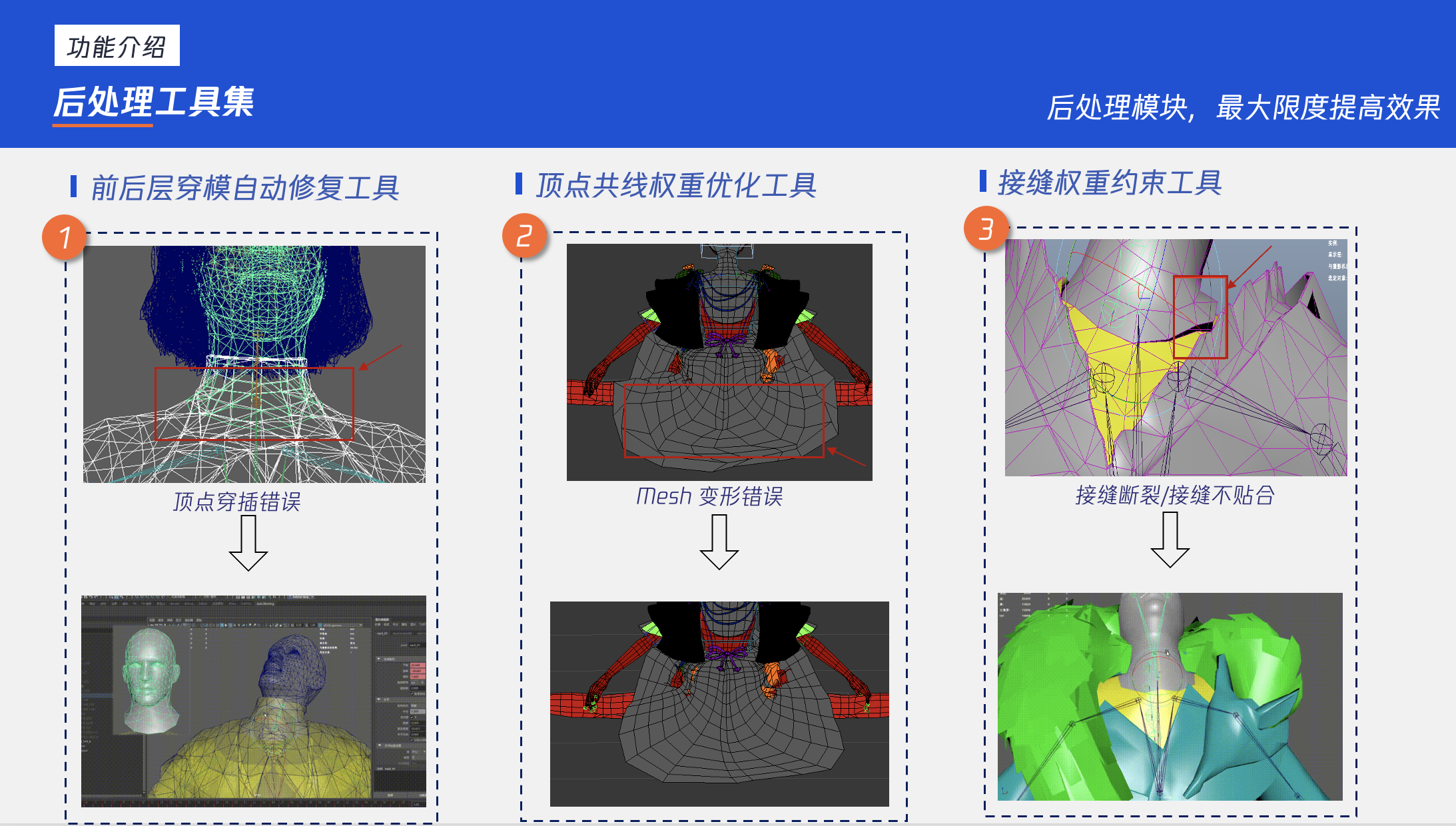 后处理工具集则提供了一系列的工具,如下图所示,包括穿插修复工具、形变矫正工具、权重约束工具等等,这些工具集可作为自动或半自动(根据用户选择)后处理工具大幅提高 GoSkinning 整体自动化程度。用于进一步细化和调整衣物的细节,确保最终效果的完美呈现。通过这两个模块的协同工作,可以有效地解决局部问题,提升整体的视觉效果和质量。