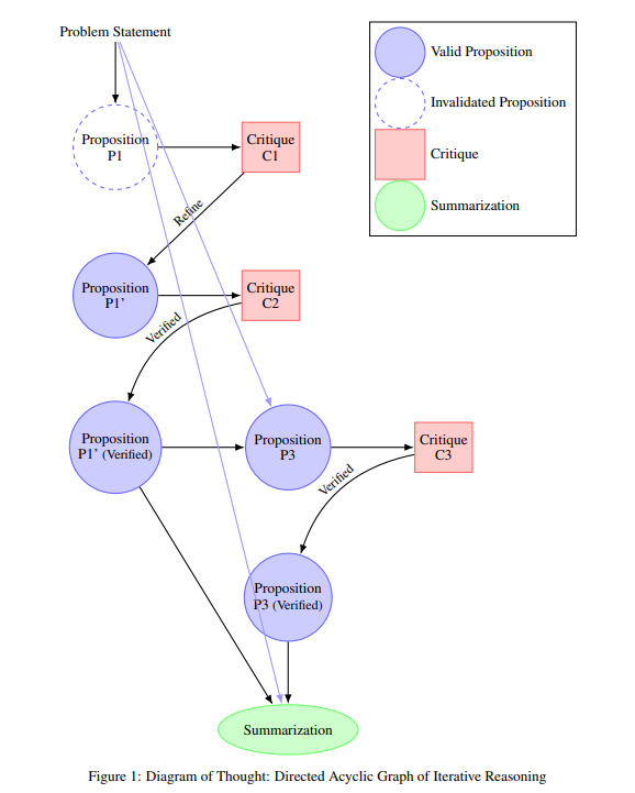 DoT框架的核心理念是模仿人类解决复杂问题的思维过程。就像我们在解答难题时会不断提出假设、批判、修正,最终得出结论一样,DoT让AI能够在单个模型内部构建一个有向无环图(DAG),实现更接近人类的推理方式。
