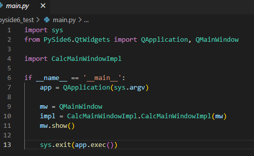 学习pyside6和python,照着教程做个简单界面,运行时报错,帮忙看看啥问题(第一个图是报错的UI生成的PY文件,后面两个图是实现类和主调文件)