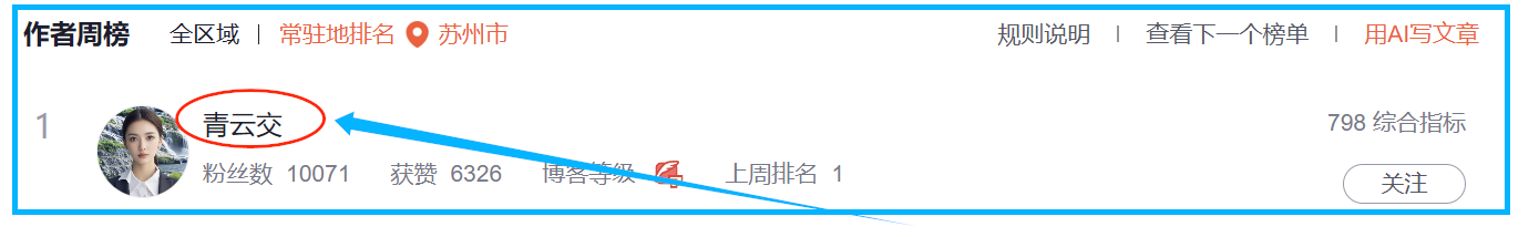 分享今日,【青云交】(https://qingyunjiao.blog.csdn.net/)恰似一颗璀璨夺目的星辰,熠熠生辉,再度成功登上苏州地区作者周榜榜首之位。这份至高无上的荣耀,如同一道绚烂无比的光芒,瞬间照亮了前行之路。心中那汹涌澎湃的激动之情,犹如滔滔巨浪,翻滚不息,难以平复。