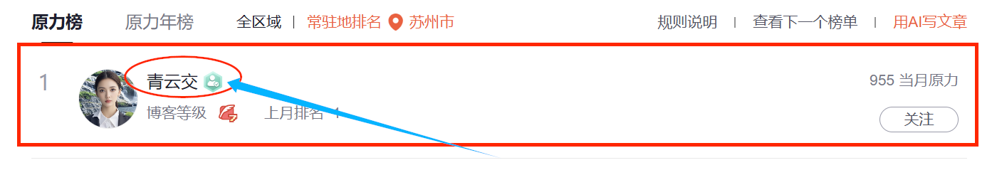 分享今日(10月 21日),【青云交】( https://qingyunjiao.blog.csdn.net/ )已连续四十八天傲然登顶苏州地区原力榜榜首之位,宛如一颗璀璨夺目的明星,稳稳屹立于这光辉的宝座之上。这份荣耀恰似夜空中最为耀眼的星辰,熠熠生辉,如同一束明亮而炽热的光芒,照亮了前行的道路。心中那难以言表的激动之情,恰似汹涌澎湃的浪潮,翻腾不息,久久难以平静。回首过往,每一份努力都如点点璀璨的星光,缓缓汇聚,最终铸就了今日的辉煌成就。