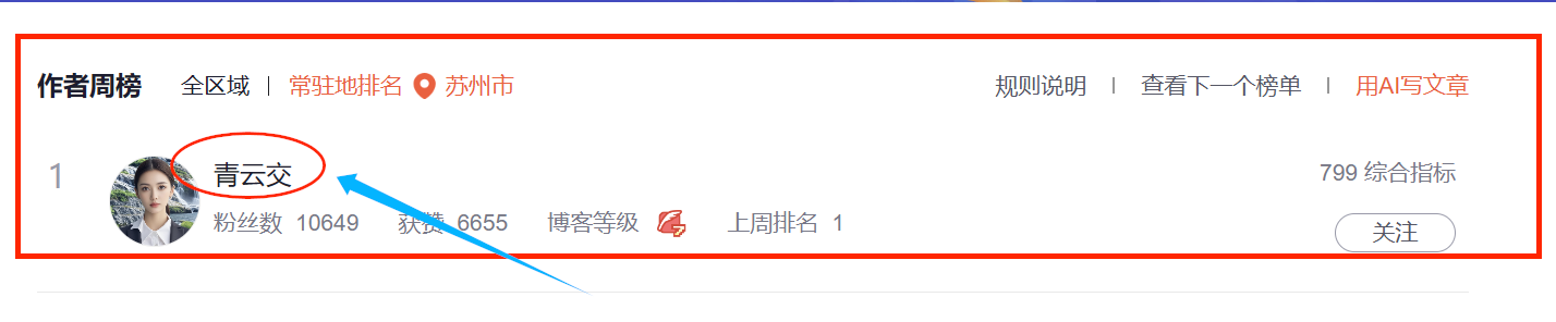 今日,【青云交】(https://qingyunjiao.blog.csdn.net/)恰似一颗璀璨夺目的星辰,熠熠生辉,再度成功登上苏州地区作者周榜榜首之位。这份至高无上的荣耀,如同一道绚烂无比的光芒,瞬间照亮了前行之路。心中那汹涌澎湃的激动之情,犹如滔滔巨浪,翻滚不息,难以平复。