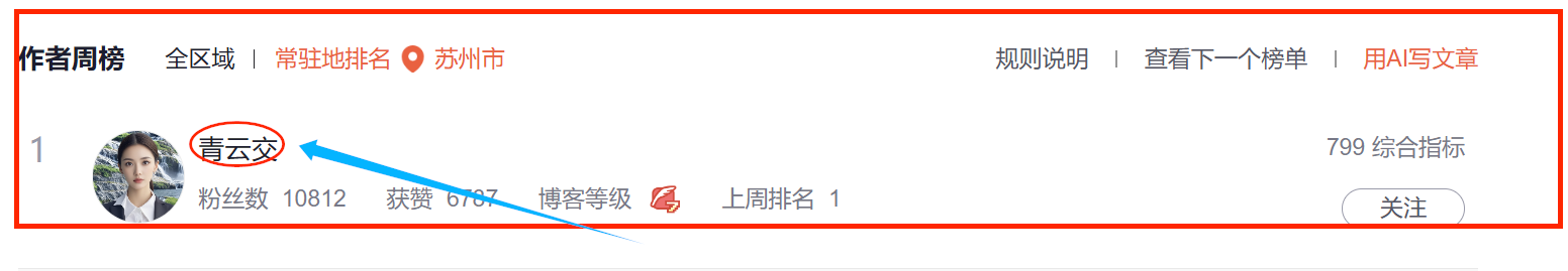 今日,【青云交】(https://qingyunjiao.blog.csdn.net/)恰似一颗璀璨夺目的星辰,熠熠生辉,再度成功登上苏州地区作者周榜榜首之位。这份至高无上的荣耀,如同一道绚烂无比的光芒,瞬间照亮了前行之路。心中那汹涌澎湃的激动之情,犹如滔滔巨浪,翻滚不息,难以平复。