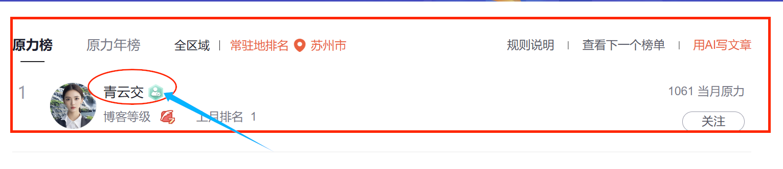分享今日(10月 24日),【青云交】( https://qingyunjiao.blog.csdn.net/ )已连续五十一天傲然登顶苏州地区原力榜榜首之位,宛如一颗璀璨夺目的明星,稳稳屹立于这光辉的宝座之上。这份荣耀恰似夜空中最为耀眼的星辰,熠熠生辉,如同一束明亮而炽热的光芒,照亮了前行的道路。心中那难以言表的激动之情,恰似汹涌澎湃的浪潮,翻腾不息,久久难以平静。回首过往,每一份努力都如点点璀璨的星光,缓缓汇聚,最终铸就了今日的辉煌成就。