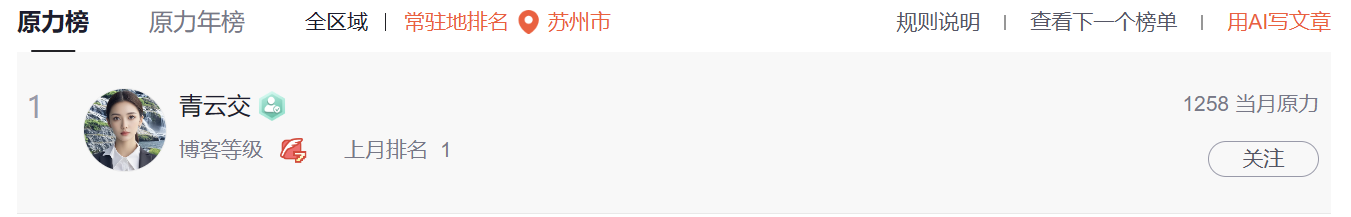 分享今日(10月 27日),【青云交】( https://qingyunjiao.blog.csdn.net/ )已连续五十四天傲然登顶苏州地区原力榜榜首之位,宛如一颗璀璨夺目的明星,稳稳屹立于这光辉的宝座之上。这份荣耀恰似夜空中最为耀眼的星辰,熠熠生辉,如同一束明亮而炽热的光芒,照亮了前行的道路。心中那难以言表的激动之情,恰似汹涌澎湃的浪潮,翻腾不息,久久难以平静。回首过往,每一份努力都如点点璀璨的星光,缓缓汇聚,最终铸就了今日的辉煌成就。