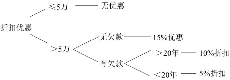 判断树 以某企业销售策略为例构造判断树和判断表。某企业对不同交易额、不同信用的新老客户采取不同的优惠待遇,具体策略是:每年交易额小于等于5万的客户不给优惠;每年的交易额大于5万的客户,如无欠款,给15%的折扣率;如果有欠款,还应考虑客户与本企业的交易时间,交易时间大于等于20年,折扣率10%,小于20年,折扣率5%。