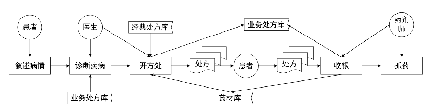 中医治疗过程的业务流程图如图所示。医生在听取患者的病情叙述后,根据脉象和症状进行疾病诊断,根据诊断结果从经典处方库中找到合适的处方,或者医生根据患者的个体差异,灵活地确定处方。患者在拿到处方后,先付款,然后药剂师根据处方编号(条形码),从业务处方库当中读取处方的药材信息,按照数据库中的内容,将配成的药剂交给患者。