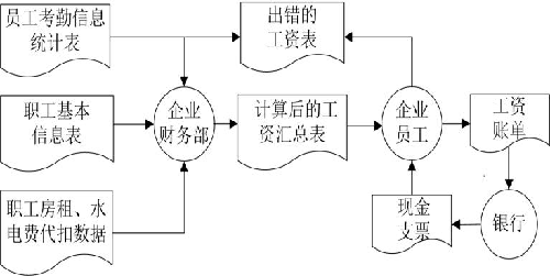 以企业财务部门发放员工工资业务流程为例,企业财务部在核算员工工资前将会统计员工考勤信息表、职工基本信息表以及职工房租、水电费代扣数据,并将计算后的工资汇总表发放给企业员工,由企业员工自行审核。若员工审核发现错误,则将出错的工资表返还给财务部门重新进行审核。企业员工对工资汇总信息审核无误后生成工资账单,并通过系统发送给银行,银行根据工资账单信息将工资发给相应的企业员工。