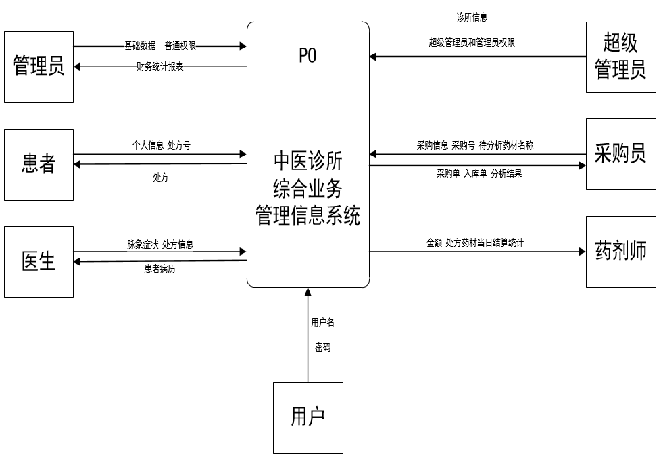根据中医诊所综合业务,首先画出第0层的数据流程图,如图所示。系统需要的交互信息来源包括患者、医生、采购员、药剂师。管理员和超级管理员是系统运行的要求,不属于业务信息,因存在对系统的操作,因此存在数据流程。