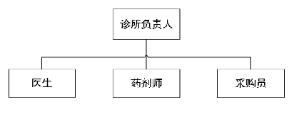 该中医诊所的组织结构简单、采用传统的直线结构。组织结构图如图所示。 诊所负责人:诊所的所有者,直接领导医生、药剂师、采购员,负责诊所管理工作,并拥有财务管理的权限。 医生:对患者进行诊疗,并开具处方。 药剂师:药房抓药,附加收银职能。 采购员:时刻检测药房的库存状况,负责药材的采购和入库。