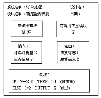 IPO图的主体是算法说明部分(数据处理),可採用结构化语言、判定表、判定树,也可用N-S图、问题分析图和过程设计语言等工具进行描写叙述,要准确而简明的描写叙述模块运行的细节。