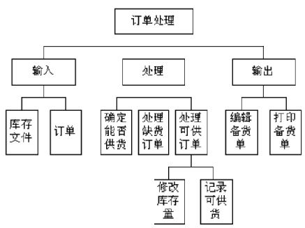 练习 请根据某企业订单处理系统的数据流程图(如下图),应用HIPO图法进行模块层次功能分解。