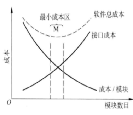 如果无限地分割软件,最后为了开发软件而需要的工作量就小得可以忽略了。上述结论不能成立,如图,当模块数目增加时每个模块的规模将减小,开发单个模块需要的成本确实减少了,但是随着模块数目增加,设计模块间接口所需要的工作量也将增加。根据这两个因素。得出了图中的总成本曲线。每个程序都相应地有一个最适当的模块数目M,使得系统的开发成本最小。
