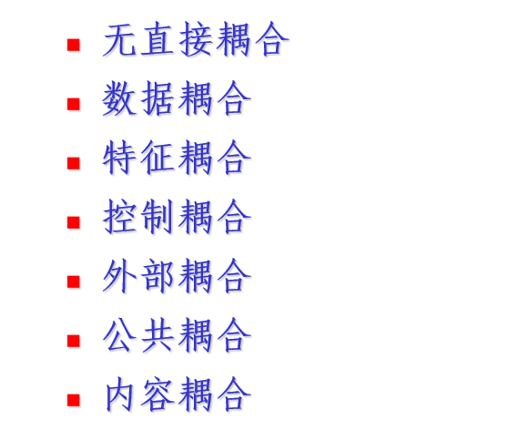耦合是对一个软件结构内不同模块之间互连程度的度量。在软件设计中应该追求尽可能松散耦合的系统(由于模块间联系简单,发生在一处的错误传播到整个系统的可能性就很小)。