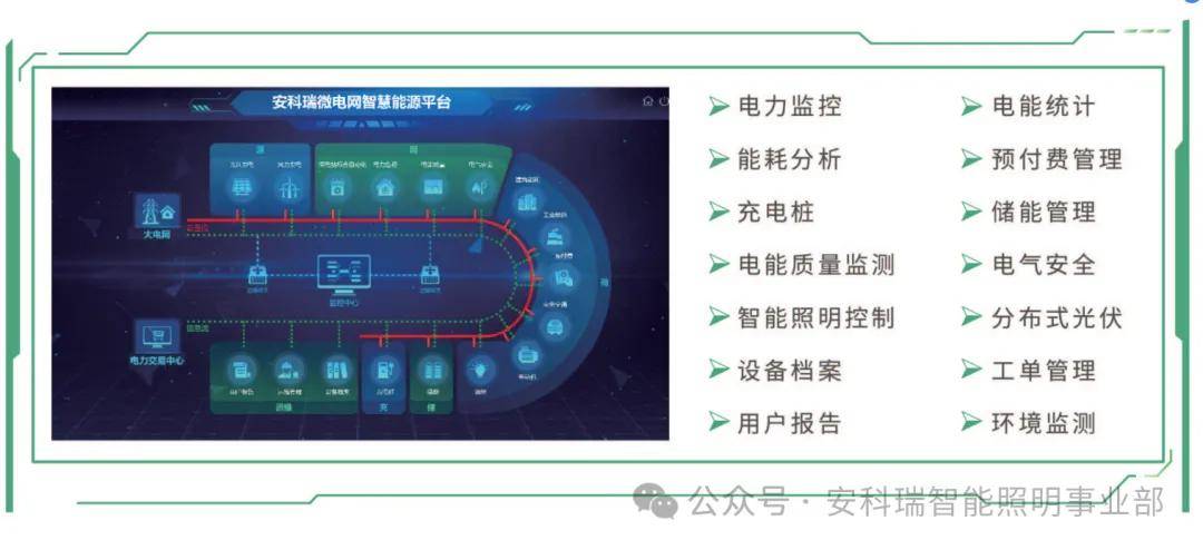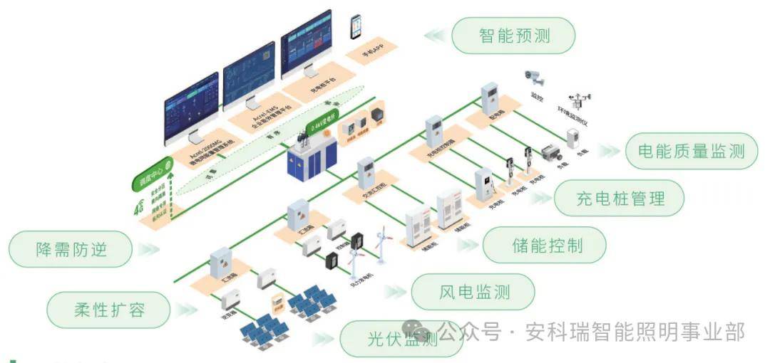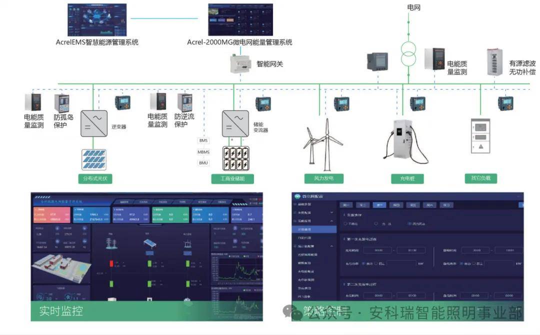 AcrelEMS 3.0智慧能源管理平台对企业微电网分布式电源、市政电源、储能系统、充电设施以及各类交直流负荷的运行状态实时监视、智能预测、动态调配,优化策略,诊断告警,可调度源荷有序互动、能源全景分析,满足企业微电网能效管理数字化、安全分析智能化、调整控制动态化、全景分析可视化的需求,完成不同策略下光储充资源之间的灵活互动与经济运行,降低用户能源成本,提高企业微电网运行效率。
