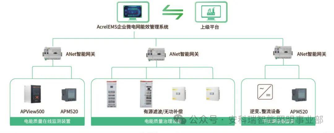 电能质量治理系统提供电能质量的监测、分析和治理解决方案,系统可监测企业微电网电能质量数据和治理情况,及时对异常进行预警,数据可上传AcrelEMS平台。系统包含电能质量在线监测装置和电能质量治理装置,装置可通过以太网或RS485通讯接口接入ANet智能网关,然后数据上传AcrelEMS企业微电网能效管理平台。