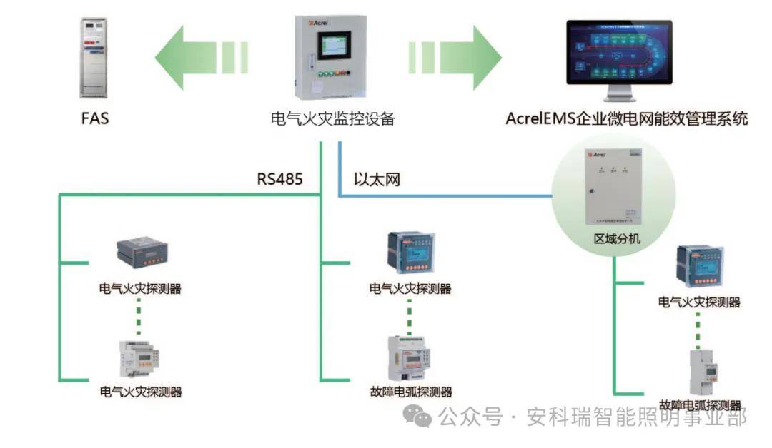 电气火灾监控系统主要应用于0.4kV低压配电系统中,用于检测TN-C-S、TN-S及局部TT系统中的剩余电流、温度、故障电弧、电压、电流等电气参数,从而预防电气火灾的发生。当被保护线路中探测器参数超过报警设定值时,能产生报警和控制信号,以便消除电气故障引起的电气火灾隐患。根据用户的需求,系统可以满足与AcrelEMS企业微电网能效管理平台或火灾自动报警系统等进行数据交换和共享。