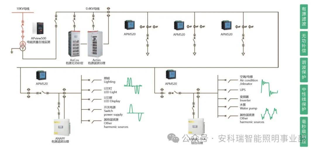 电能质量治理系统主要是研究供配电系统中的无功补偿和谐波治理问题,主要的产品有电能质量在线监测装置、有源电力滤波装置、低压无功功率补偿装置、静止无功发生器、混合动态滤波补偿装置、混合动态消谐补偿装置、智慧型动态无功补偿装置、谐波保护器等,适用于新建、改建、扩建和技改项目中工业与民用及公共建筑内电气设备的无功补偿、谐波抑制及综合治理等,可根据不同行业类型和负载类型的电能质量问题提供合适的解决方案,以达到改善供电质量和确保电力系统安全经济运行的目的。