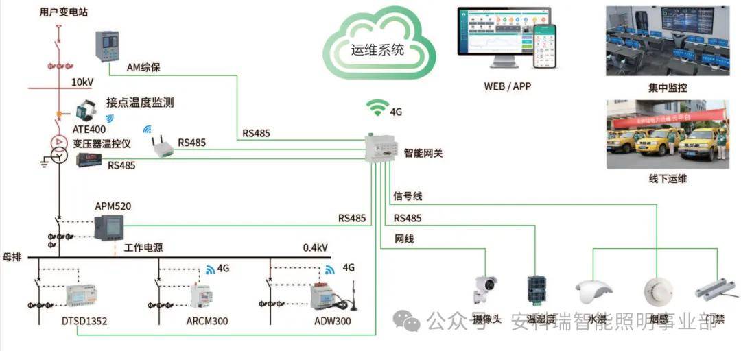 变电所运维平台通过在变电所配电回路设置多功能仪表用于采集配电系统运行数据,设置温湿度、水浸、烟雾、门禁等传感器用于采集变电所环境数据,设置网络摄像机用于采集变电所内部视频数据,设备通过RS485接口接入智能网关,经过协议转换和数据处理后通过互联网或者4G上传运维平台,实现对数量众多的变电所的数据采集和异常预警。