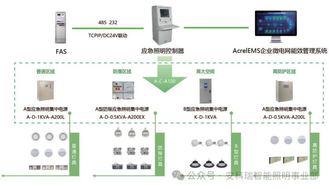 消防应急照明和疏散指示系统由应急照明控制器、应急照明集中电源和消防应急灯具(消防应急标志灯具、消防应急照明灯具)等几部分组成。系统配合火灾报警控制器的使用,在火灾时刻,能够准确给出安全的疏散路径指示,帮助建筑内的人群选择逃生疏散路线,指引安全逃生方向,保障群众的人身安全。根据用户的需求,系统可以满足与AcrelEMS企业微电网能效管理平台或火灾自动报警系统等进行数据交换和共享。