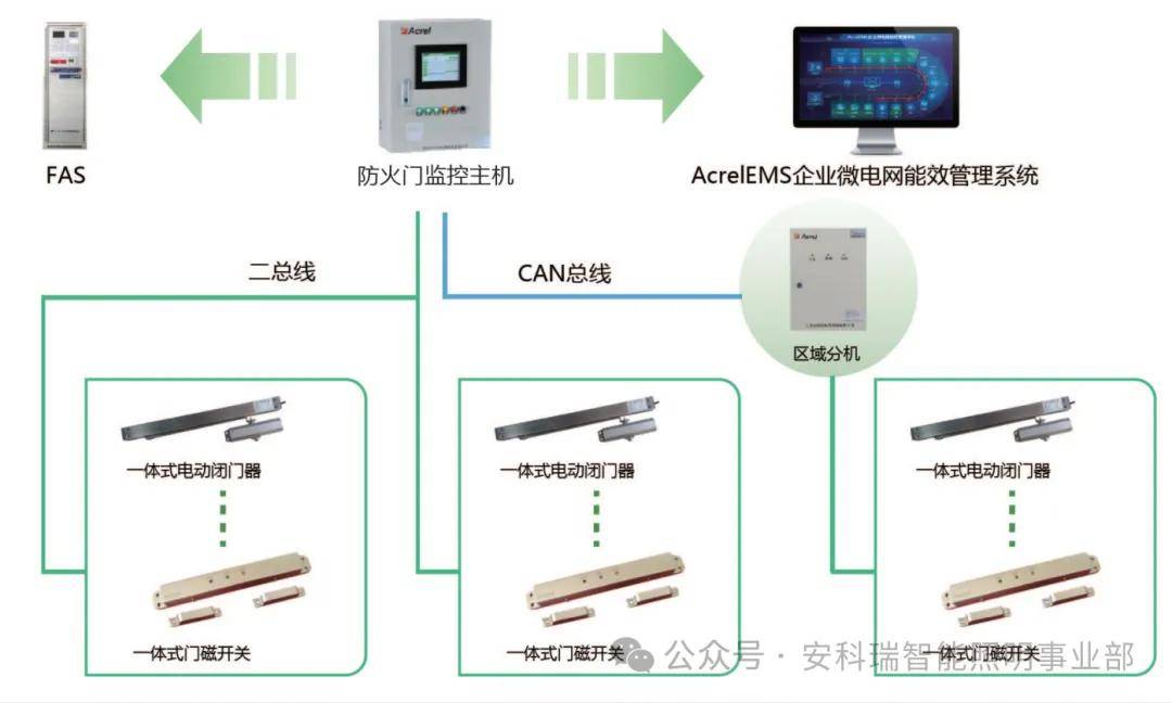 AFRD防火门监控系统集中控制其各终端设备即一体式常开、常闭防火门监控模块的工作状态,实时监测疏散通道防火门的开启、关闭及故障状态,系统采用消防二总线将具有通信功能的监控模块相互连接起来,当防火门状态异常时时,防火门监控器能发出故障报警信号,能指示故障报警部位并保存报警信息。根据用户的需求,系统可以满足与AcrelEMS企业微电网能效管理平台或火灾自动报警系统等进行数据交换和共享。