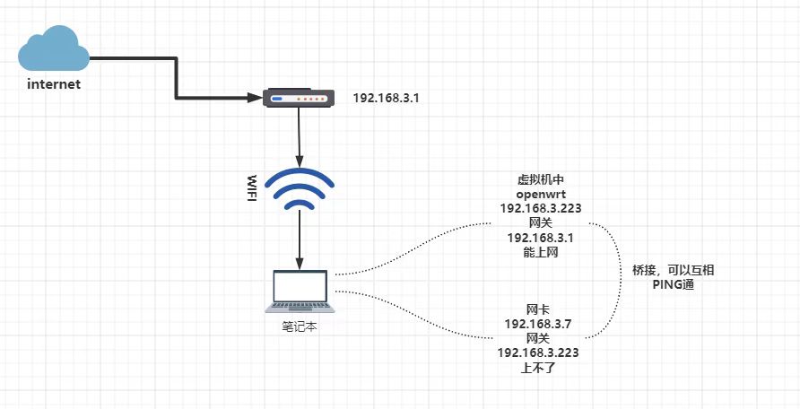 我的网络结构如上,只有一张无线网卡的笔记本电脑装虚拟机,虚拟机装openwrt做旁路由,笔记本可以指向这个旁路由上网吗? Open wrt可以上网了,但是笔记本指向它之后笔记本上不了,Open wrt还可以上。