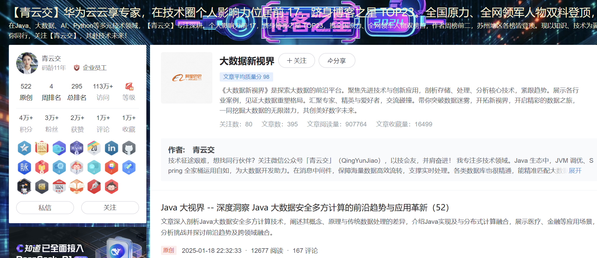 本文讲述作者 12 年技术成长历程,从初入编程面对难题,到成功处理 TB 级电商数据。依托 CSDN 平台,400 篇文章涵盖 Java、大数据等多领域,获多项榜单佳绩,粉丝超 27300 人。拥有两个技术社区,成果丰硕。关注到如 DeepSeek 等前沿技术,未来将深耕大数据隐私保护、AI 大模型等,计划举办线上分享会,根据粉丝反馈优化内容,感恩粉丝支持,携手共赴技术新征程。