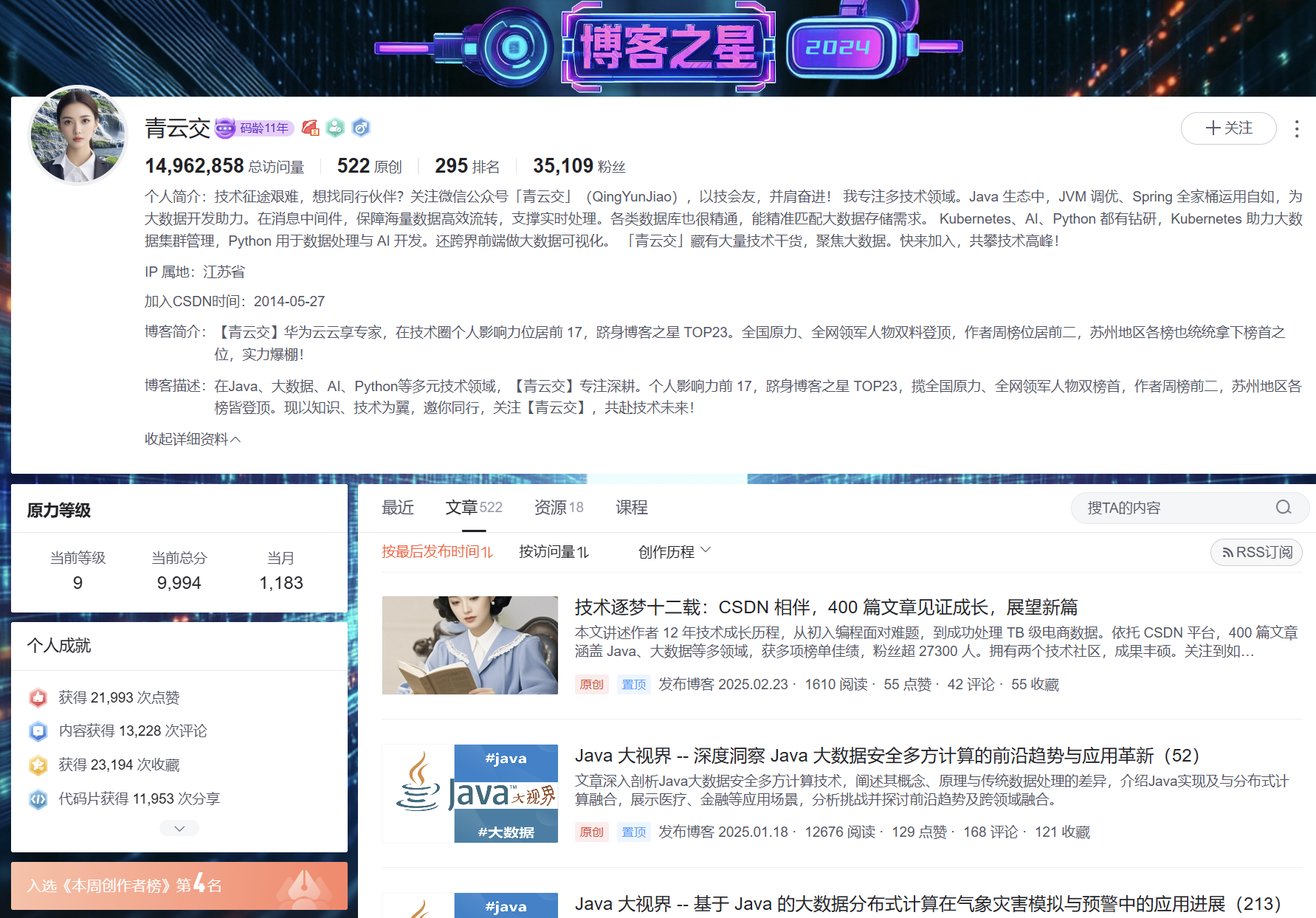 今天是4月25日,周五,又要见面了,【青云交】( https://qingyunjiao.blog.csdn.net/ )总流量已突破 1496 万大关。原创佳作已突破 522 篇,收获粉丝:35109,总排名:295,周排名:4 ,在这个值得庆祝的日子里,我们怀揣着无尽的感恩与诚挚之情,向大家致以最为衷心的谢意。衷心感谢大家长久以来对【青云交】的热情支持与深深喜爱。