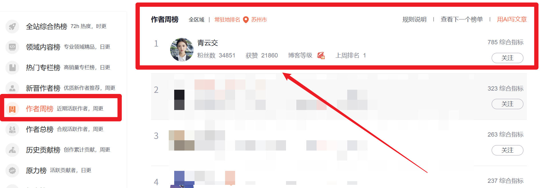 周五【青云交】荣登作者周榜全国第四,苏州榜首